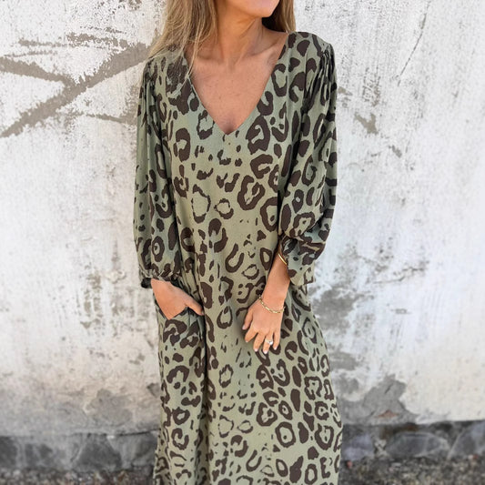 Damen lässiges Maxikleid im Leopardenmuster mit tiefem V-Ausschnitt Stalluxe