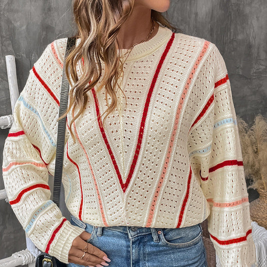 Damen lockerer Strickpullover mit modischem Lochmuster und farbigen Streifen Stalluxe