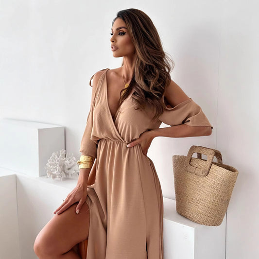 Damen Maxikleid mit schulterfreier Optik und elegantem V-Ausschnitt Stalluxe