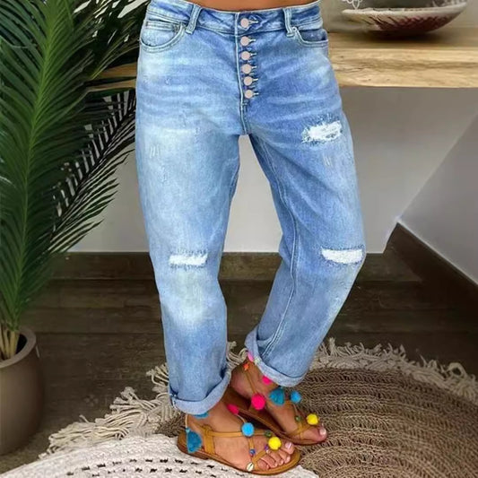 Damen Boyfriend Jeans mit Knopfverschluss und Distressed-Details Stalluxe