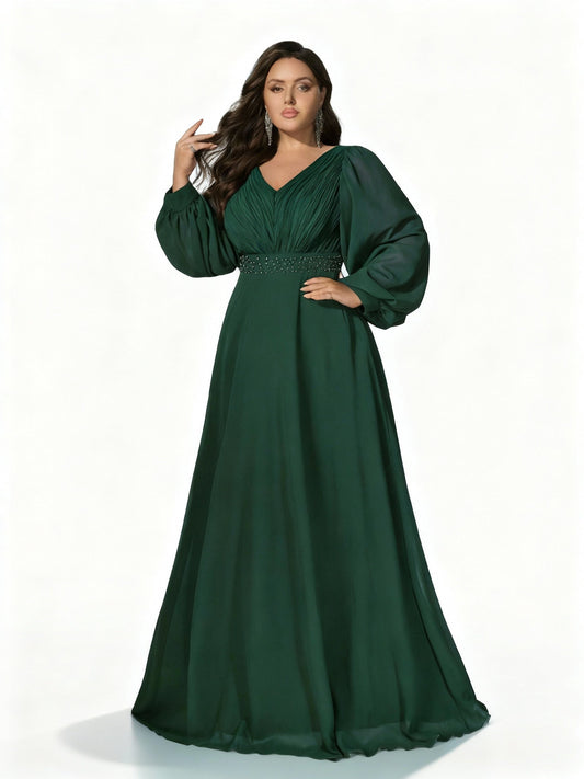 Stalluxe | Dunkelgrünes Abendkleid in Übergröße mit Perlenverzierung an der Taille
