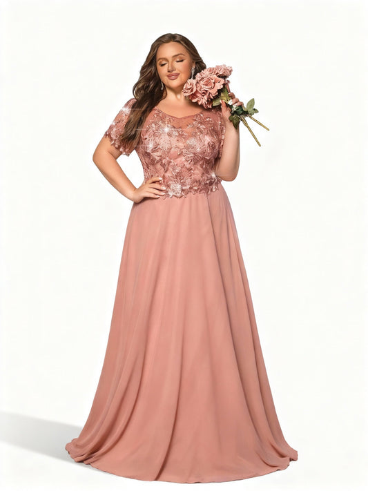 Stalluxe | Rosafarbenes Spitzenkleid in Übergröße mit Applikationen und Kurzem Ärmel