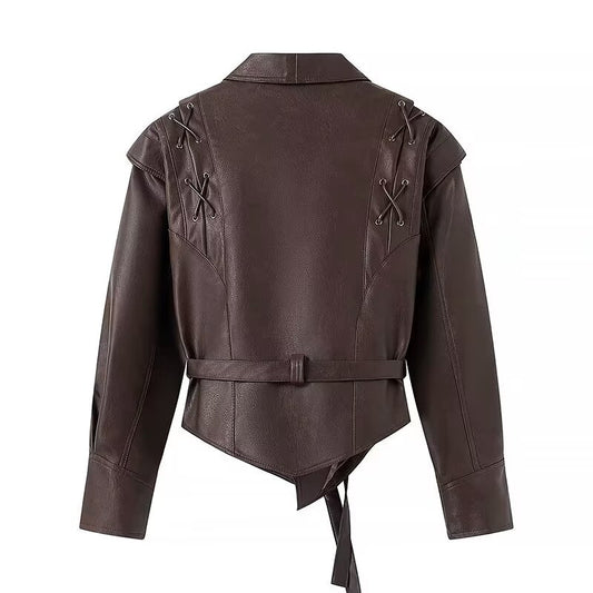 Damen Kunstlederjacke mit taillierbarem Gürtel und kontrastierenden Nähten Stalluxe