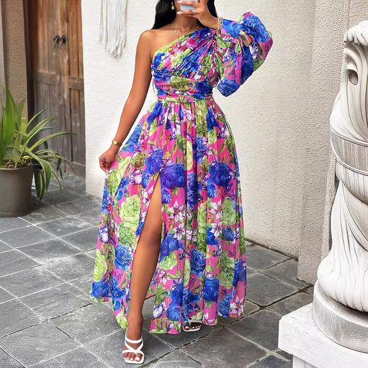 Damen Exquisites One-Shoulder Maxikleid mit floralem Design und Schlitz Stalluxe