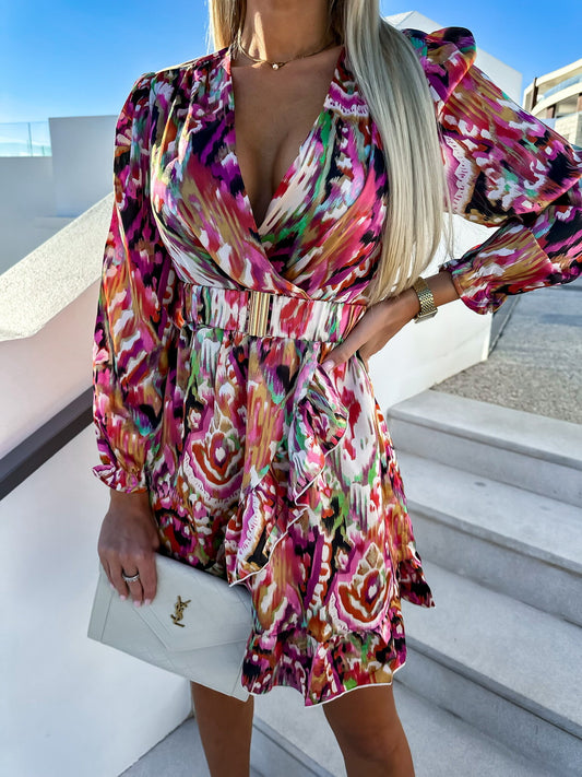 Damen Elegantes Wickelkleid mit buntem Muster und Rüschendetails Stalluxe
