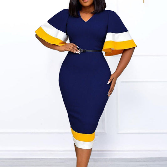 Damen Elegantes V-Ausschnitt Kleid mit kontrastierenden Volantärmeln und Taillengürtel Stalluxe