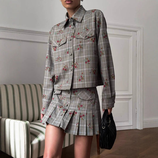 Damen Karierte Blousonjacke mit floralen Akzenten und dazu passendem Rock Stalluxe