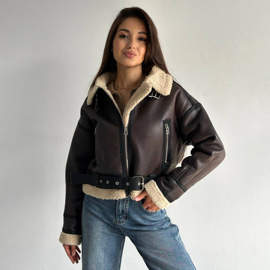 Damen Kunstlederjacke mit hochwertigem Fleece-Futter und figurformendem Gürtel Stalluxe