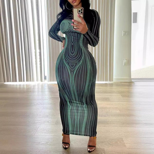 Damen Langarm Maxikleid mit modernem Batikmuster und figurschmeichelndem Schnitt Stalluxe