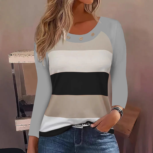 Damen Langarm T-Shirt mit modischem Streifenmuster und dekorativen Knöpfen Stalluxe