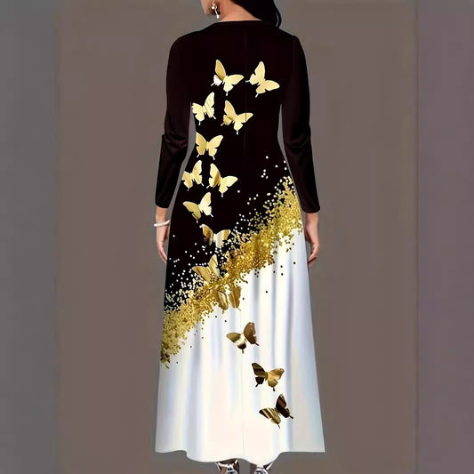 Damen Maxikleid mit elegantem Schmetterlingsmuster und funkelndem Goldakzent Stalluxe