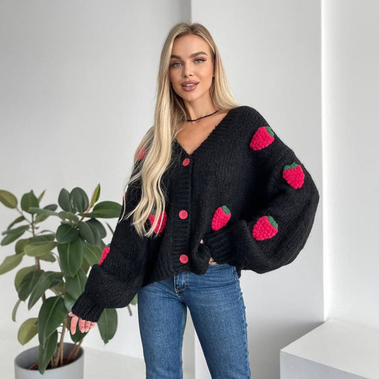 Damen Strickjacke mit verspieltem Erdbeermuster und weiten Ärmeln Stalluxe
