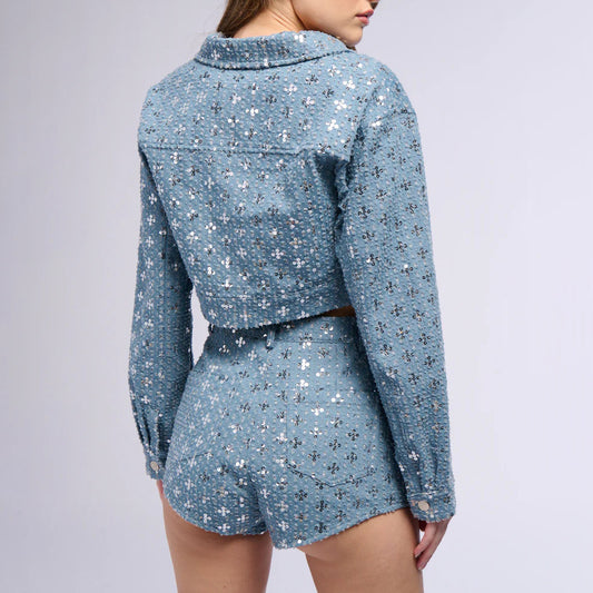 Damen Crop-Jeanjacke mit funkelndem Sternmuster und passender Short Stalluxe