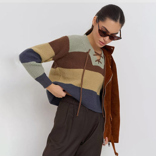 Damen Strickpullover mit lässigem V-Ausschnitt und dekorativem Schnürdetail Stalluxe