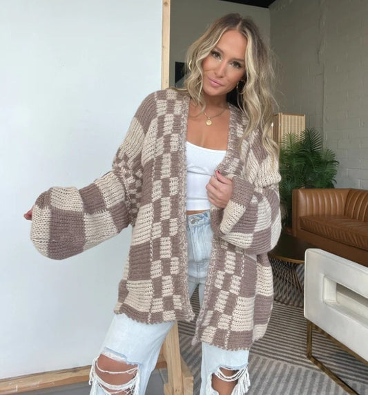Damen Übergroße Karomuster-Strickjacke mit Taschen Stalluxe