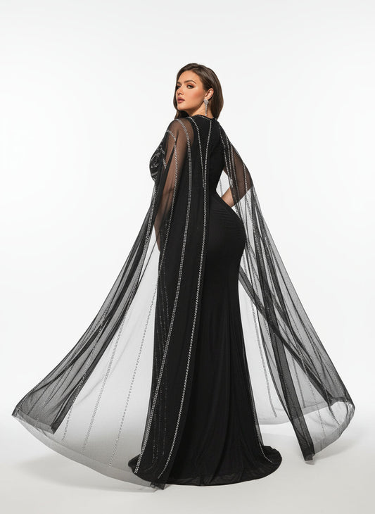 Stalluxe | Hochwertiges Schwarzes Mesh-Abendkleid mit Strass und Stehkragen, Langarm