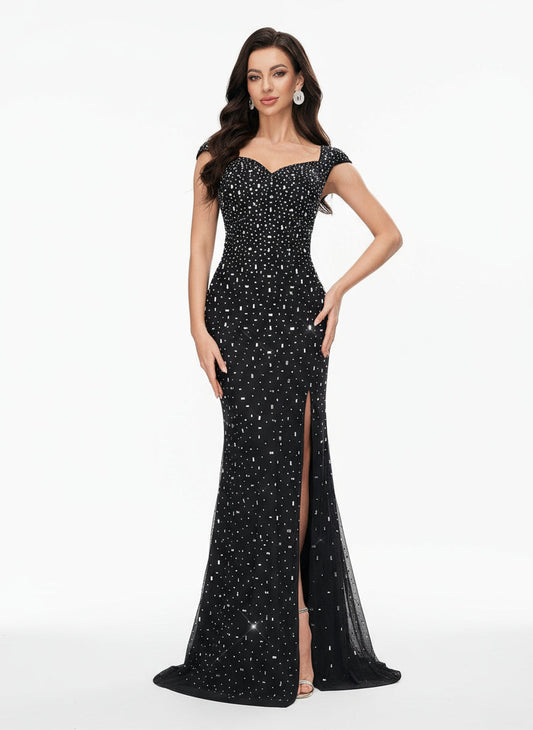 Stalluxe | Klassisches Schwarzes Abendkleid mit Perlen und Blumenmuster im Meerjungfrauenstil