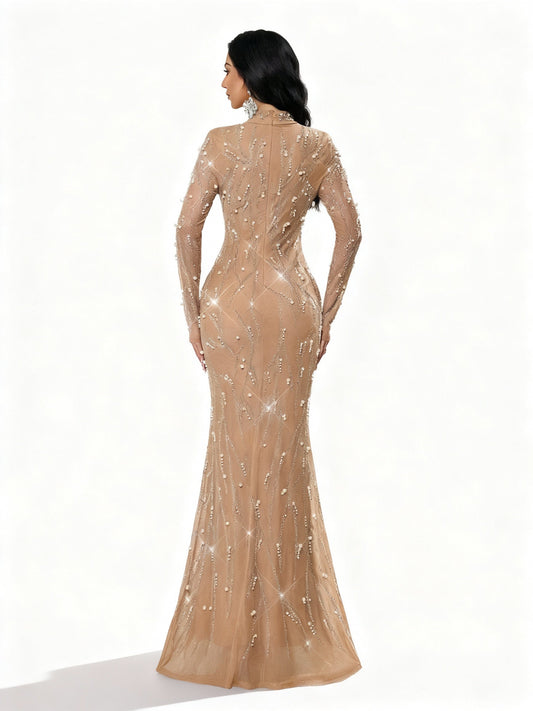 Stalluxe | Glitzerndes Apricotfarbenes Strasskleid mit Langen Ärmeln und Schlanker Silhouette