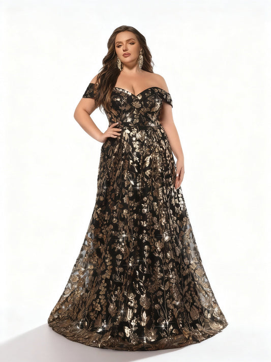 Stalluxe | Romantisches Schulterfreies Abendkleid aus Mesh mit Pailletten und Patchwork