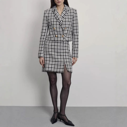 Damen kariertes Blazerjacke mit doppelter Knopfleiste und schmalen Revers Stalluxe