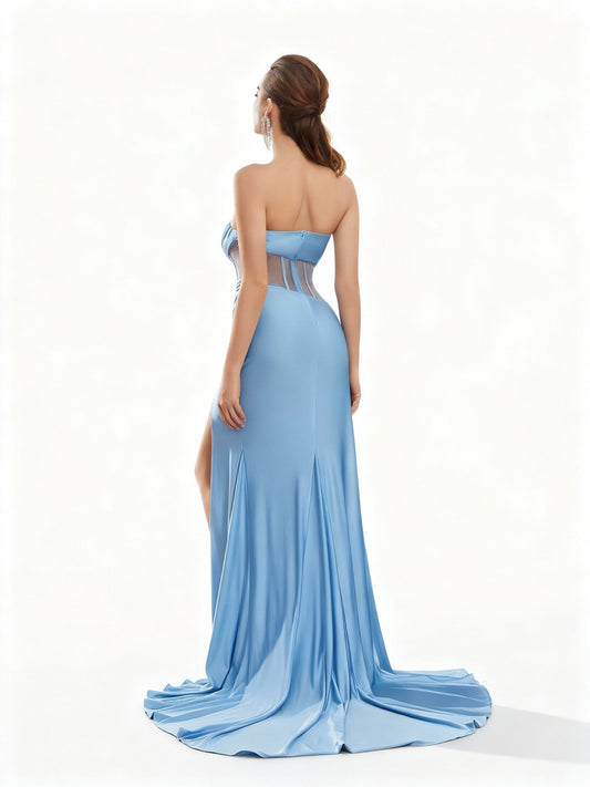 Stalluxe | Hellblaues Trägerloses Meshkleid mit Schlitz