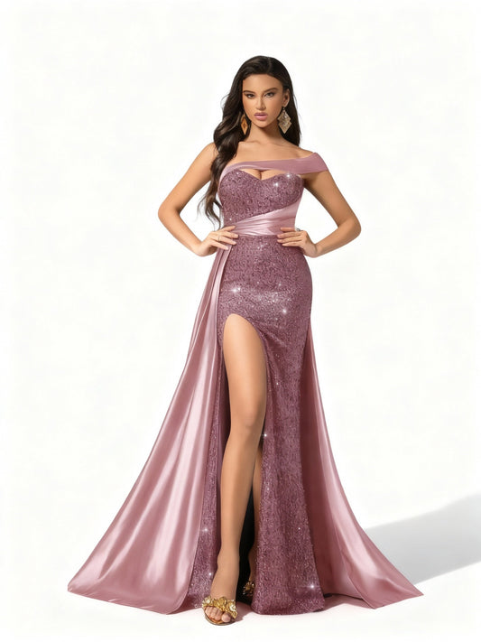 Stalluxe | Romantisches rosa One-Shoulder-Paillettenkleid mit Schlitz
