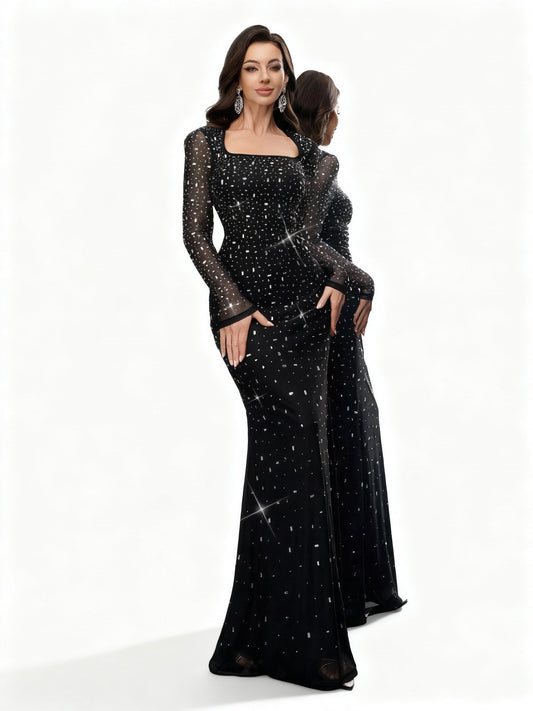 Stalluxe | Elegantes Abendkleid mit Strass und Langarm im Meerjungfrauenstil