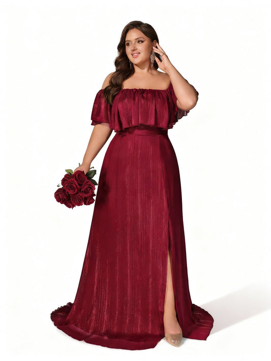 Stalluxe | Burgunderfarbenes Schulterfreies Abendkleid mit weitem Saum in Übergröße