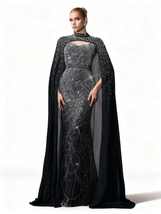 Stalluxe | Schwarzes Strass-Abendkleid mit Umhangärmeln und weitem Saum