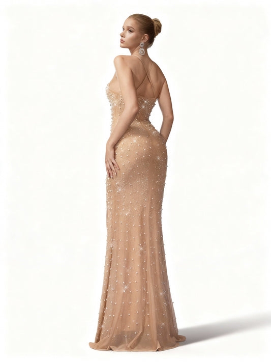 Stalluxe | Raffiniertes Apricotfarbenes Strass-Fishtail-Abendkleid mit Spaghettiträgern