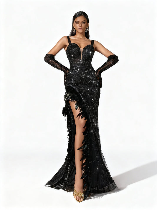 Stalluxe | Elegantes Schwarzes Abendkleid mit Strass, Stehkragen und Schlitz