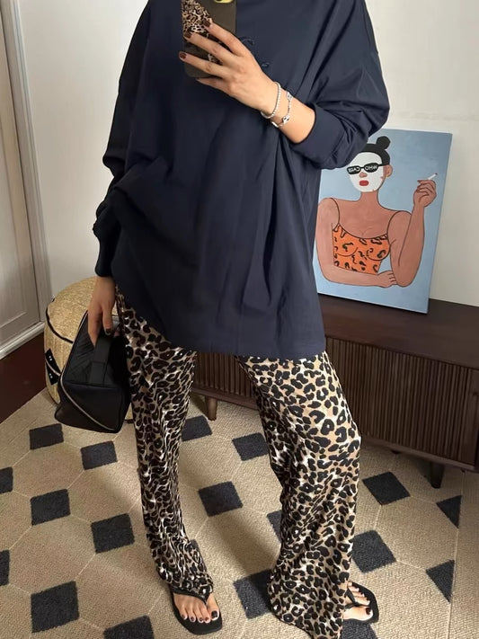 Damen Weit geschnittene Leoprint-Hose mit elastischem Bund und hohen Taschen Stalluxe