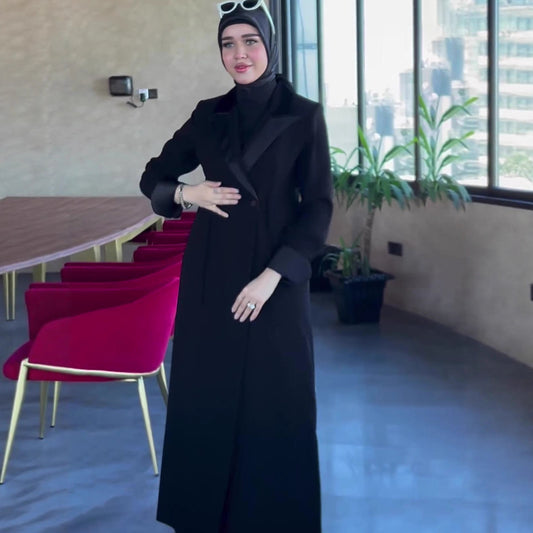 Damen Eleganter Abendmantel mit doppelter Knopfleiste und Satinakzenten Stalluxe