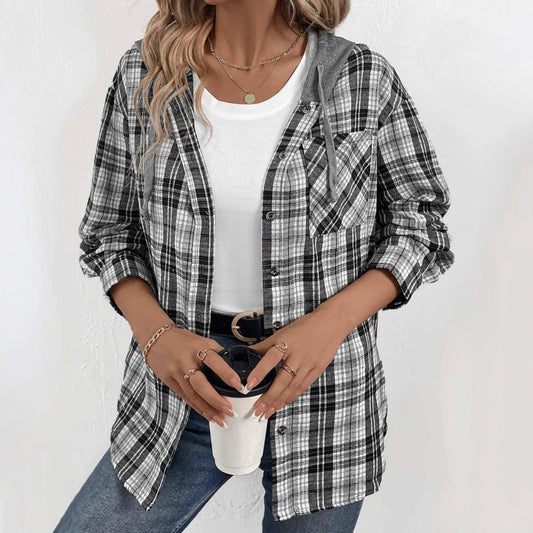 Damen lässige Flanellhemdjacke mit Kapuze und Karomuster Stalluxe