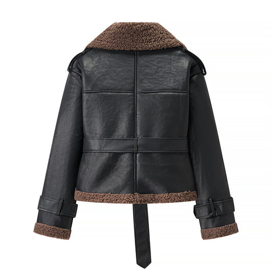 Damen Modische Kunstlederjacke mit kuscheligem Innenfutter und Bindegürtel Stalluxe