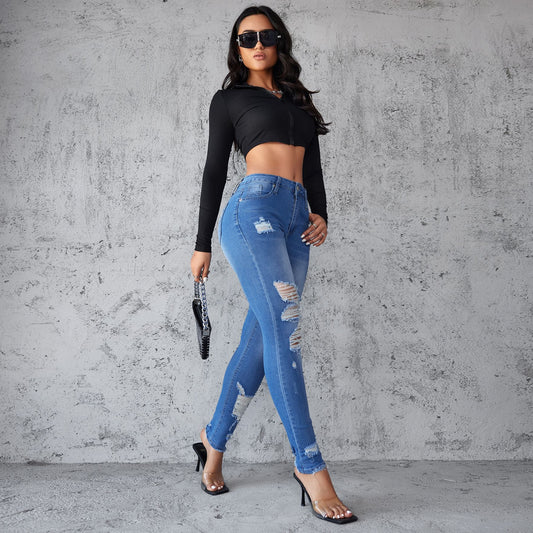 Damen Skinny Jeans im trendigen Destroyed-Design mit hoher Taille Stalluxe