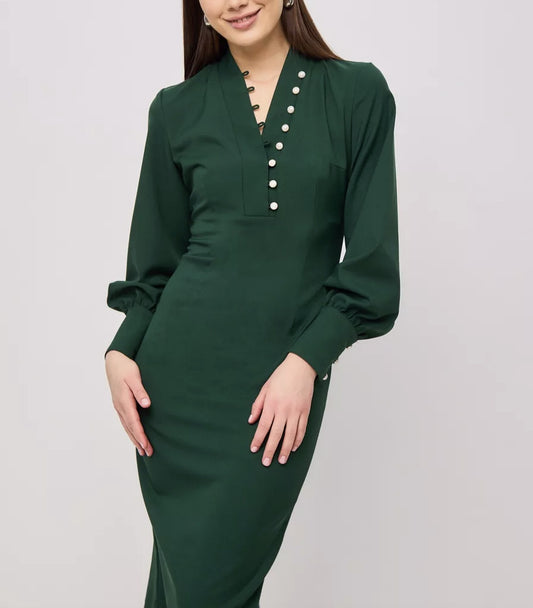 Damen elegantes Kleid mit Puffärmeln und Perlenknopfen Stalluxe