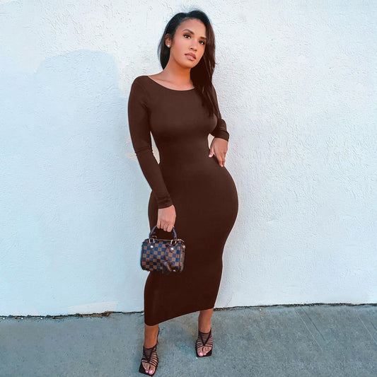 Damen Langarm Maxikleid mit knöpfbarem Ausschnitt und figurbetontem Schnitt Stalluxe