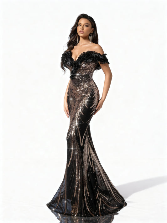 Stalluxe | Schwarzes Pailletten-Abendkleid mit schulterfreiem Design und Fischschwanz-Saum