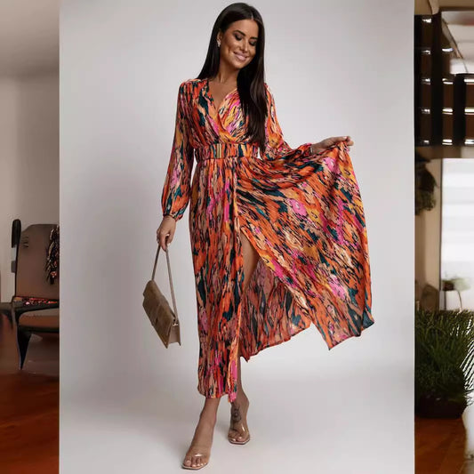 Damen Maxikleid mit elegantem, wellenförmigem Musterdruck und langem Arm Stalluxe