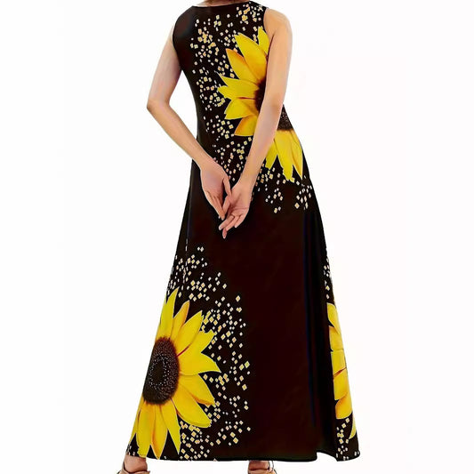 Damen Maxikleid mit buntem Sonnenblumenmotiv und praktischen Taschen Stalluxe