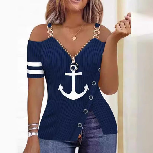 Damen Maritimes Kurzarm-Oberteil mit Reißverschluss und Ankerdesign Stalluxe