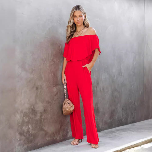 Damen Off-Shoulder Jumpsuit mit weitem Bein und elastischem Bund Stalluxe