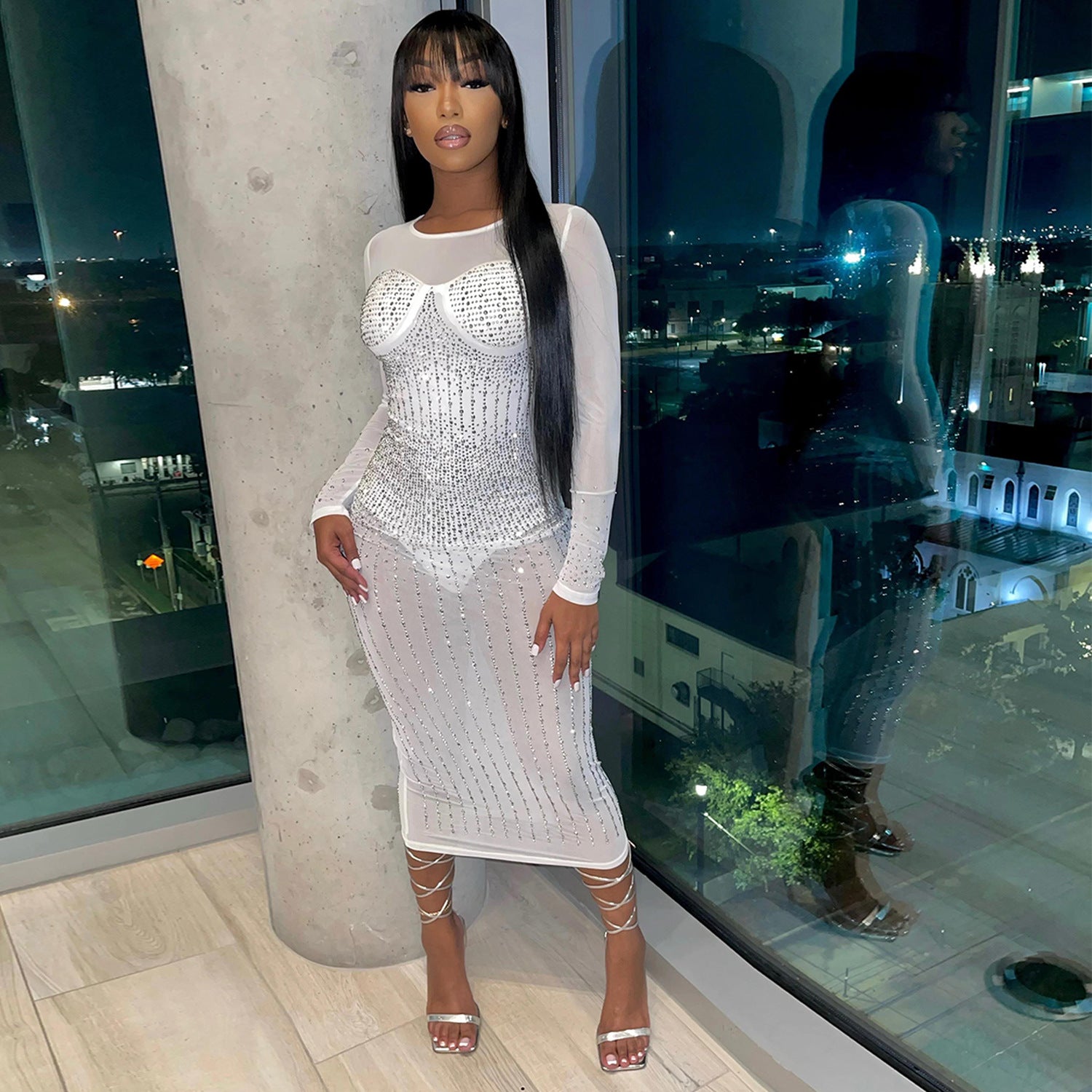 Damen Elegantes Glitzer-Maxikleid mit transparentem Oberteil und figurbetontem Schnitt Stalluxe