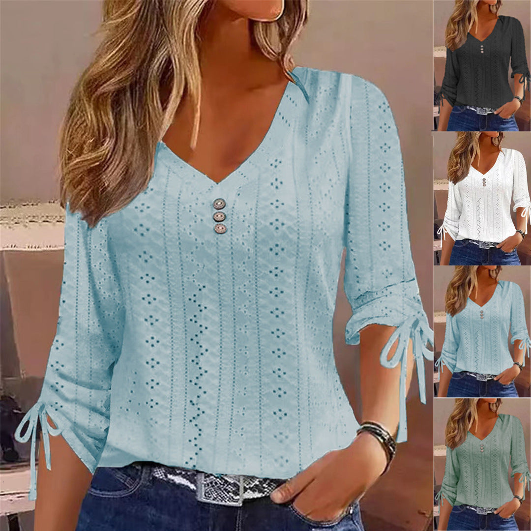Dieses Damen Oberteil vereint eine lässige Eleganz mit modernen Details. Der V-Ausschnitt und die dekorativen Knöpfe verleihen dem Shirt einen verspielten, femininen Touch und machen es zum perfekten Begleiter für zahlreiche Anlässe.