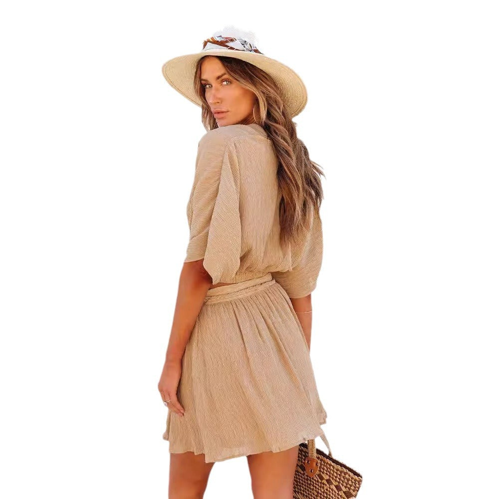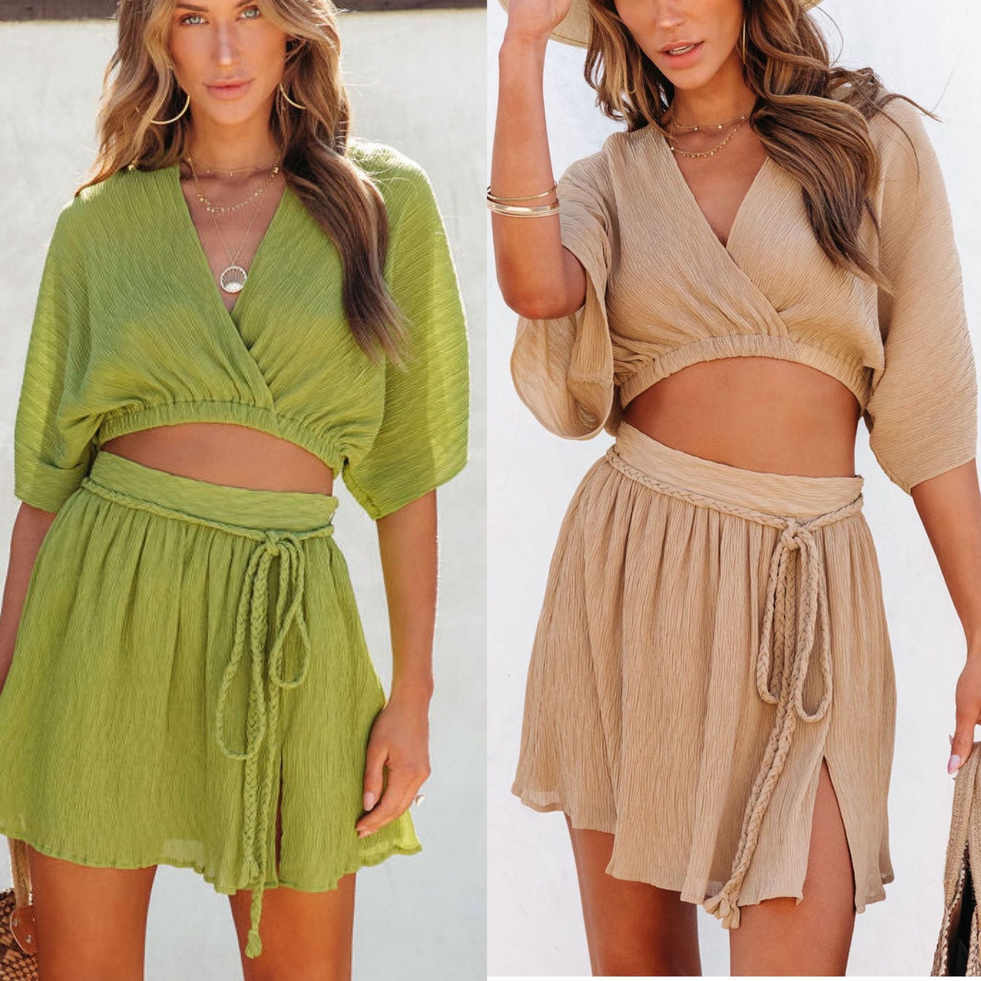 • Design: Das Set besteht aus einem kürzeren Oberteil mit weitem Schnitt und einem schmeichelhaften Rock mit einem modischen Bindegürtel, der die Taille betont.