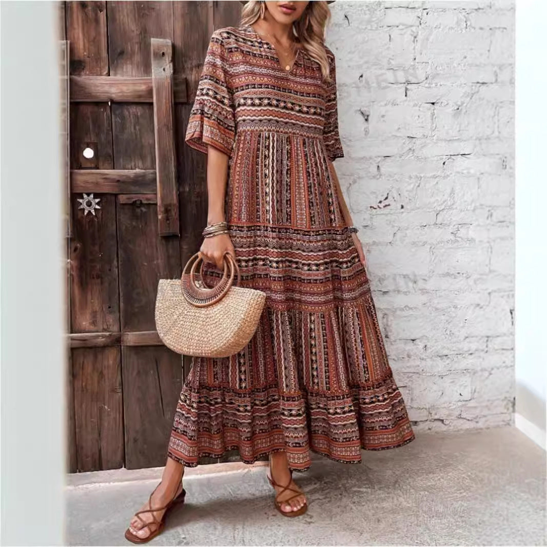Entdecken Sie das zeitlose Damen Maxikleid im Ethno-Design von Stalluxe, das ideal für entspannte Sommerausflüge oder besondere Anlässe ist.