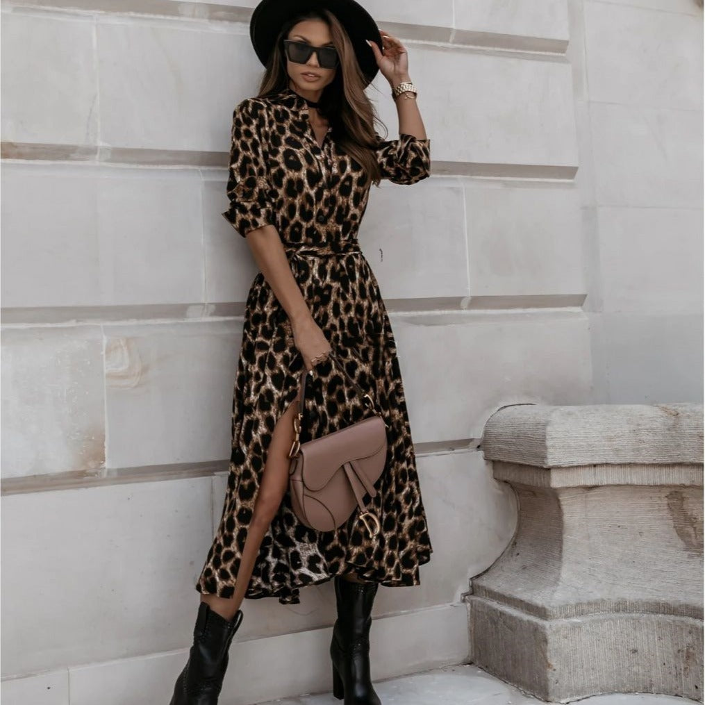 Damen Maxikleid im modernen Leopardenmuster mit eleganter Taillenbetonung und fließendem Rock Stalluxe