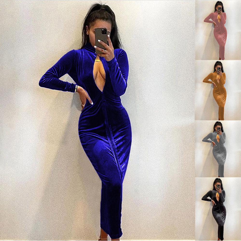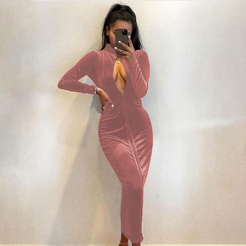 Damen Samt Maxikleid mit tiefem V-Ausschnitt und figurbetonter Silhouette Stalluxe