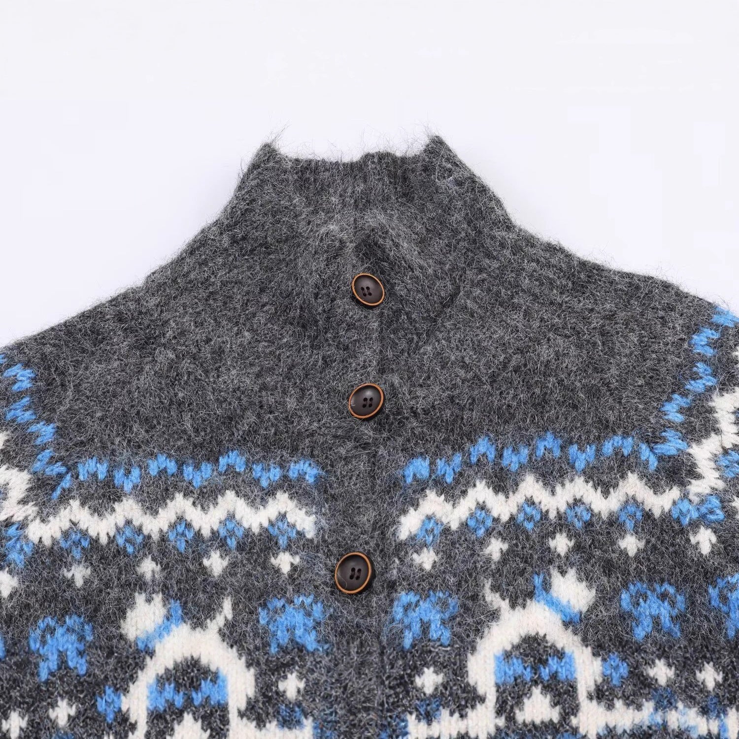 Entdecken Sie unser zeitloses Modell einer Strickjacke, die perfekt für die kühleren Tage des Jahres geeignet ist. Diese Damenstrickjacke überzeugt durch ihr attraktives Norwegermuster und den hohen Kragen, der zusätzlichen Komfort und Wärme bietet.